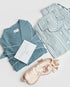 Un set de lujo discreto para los rituales de descanso más cuidados. Incluye pijama camisero de rayas Deep Blue en algodón 100% pima orgánico, bata a juego deep blue con vivo blanco y antifaz de seda personalizado.