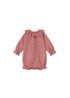 Pelele con cuello volante color teja y flores blancas y verdes.> Con botonadura trasera y snaps en la entrepierna para facilitar la puesta del pañal. De nuestra Marca Amiga Kiddo The Label.