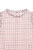 Sleeveless baby girl's romper in pink gingham with ruffle detail on the neck and pink floral sleeves.