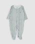 Long, collarless white baby pajamas made from 100% Pima cotton; a hypoallergenic, organically grown fabric, this, combined with its sublime softness, makes it the best fabric for protecting and caring for babies' skin.