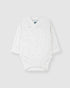 Body kimono de manga larga cruzado con corchetes, confeccionado en 100% algodón pima; tejido hipoalergénico, de cultivo ecológico, y ello junto con su suavidad sublime, lo convierte en el mejor tejido para proteger y cuidar la piel de los bebés. En estampado de estrellas, lunas y pequeñas constelaciones grises y detalle de picota blanca.