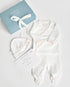 Pack de regalo compuesto por conjunto kimono + polaina y gorrito a juego, confeccionados en algodón 100% pima orgánico.